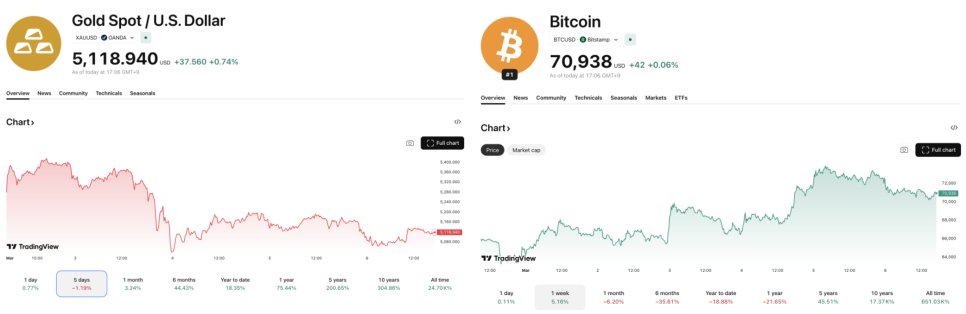 오늘은 비트코인과 이더리움 얘기를 해보겠습니다. 미국과 이란이 전쟁을 벌이는 와중에 비트코인이 7만 달러를 넘어섰습니다. 그런데 더 이상한 건 따로 있는데요. 전쟁이 나면 오른다던 금은 오히려 8% 떨어졌고, 위험자산이라던 비트코인이 14% 뛰었습니다. 과연 비트코인이 진짜 안전자산이 된 걸까요, 아니면 일시적인 착시일까요.