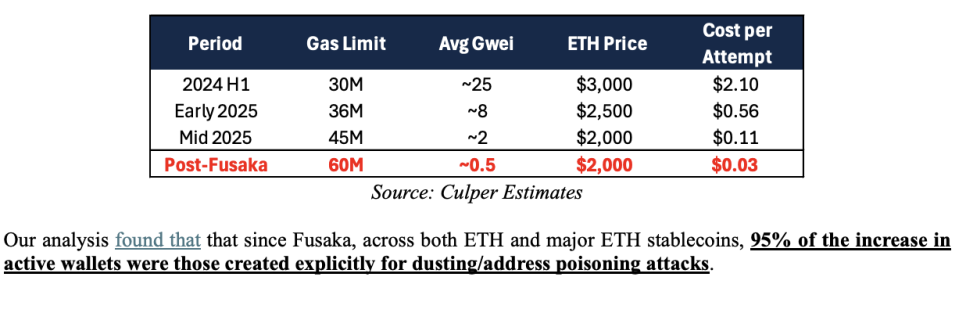 실제로 수수료가 90% 떨어지자 예상치 못한 일이 벌어졌습니다. 바로 주소 중독 공격(address poisoning)이 폭발적으로 늘어난 건데요. 이 사기 수법은 공격자들이 피해자의 지갑 주소와 앞뒤 몇 자리가 똑같은 가짜 주소를 만들어 아주 작은 금액을 보내는 겁니다. 나중에 피해자가 거래 내역을 보고 습관적으로 주소를 복사하면, 자신도 모르게 사기 주소로 돈을 보내게 되는 방식이에요. 공격 한 번의 비용이 업그레이드 이전 2.1달러에서 0.03달러로 떨어지자, 공격자들이 물량 공세로 돌아선 거죠.