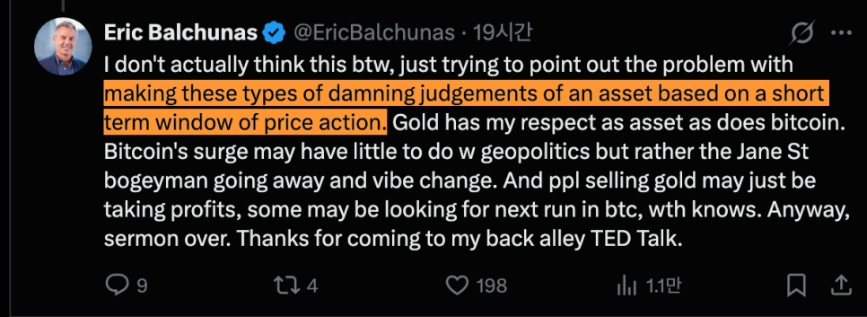 한편 ETF 애널리스트 에릭 발추나스는 단기 가격 움직임만 보고 비트코인을 안전자산으로 재정의하는 건 섣부르다고 선을 그었는데, 이 부분은 꽤 균형 잡힌 시각이라고 생각합니다. 금 가격이 떨어진 것도 단순히 사람들이 익절을 한 결과일 수도 있다는 거죠.