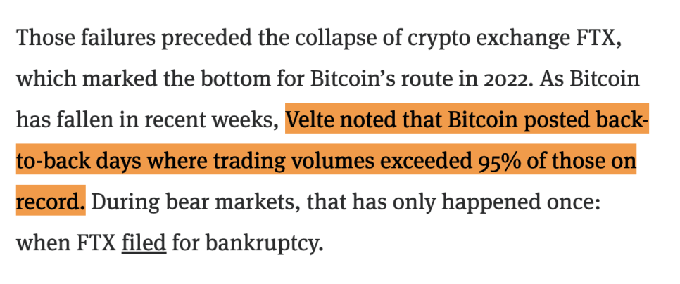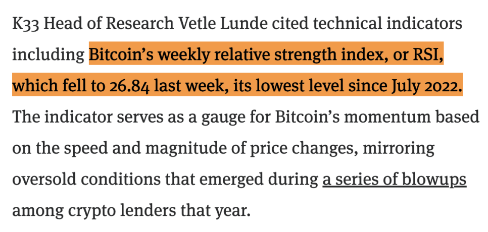 그렇다면 이걸 진짜 반등의 신호로 봐도 될까요? 암호화폐 리서치 업체 K33의 수석 애널리스트 베틀레 룬데(Vetle Lunde)는 꽤 흥미로운 분석을 내놨습니다. 지금 비트코인의 기술적 지표들이 2022년 FTX 붕괴 당시와 닮아있다는 건데요. 비트코인의 주간 RSI, 즉 가격 모멘텀 지표가 26.84까지 떨어졌는데, 이건 2022년 7월 이후 가장 낮은 수치입니다. 당시는 가상자산 대출 플랫폼 셀시우스, 쓰리애로우즈캐피털이 무너지고, 결국 FTX 파산으로 이어졌던 그 시기였죠.
