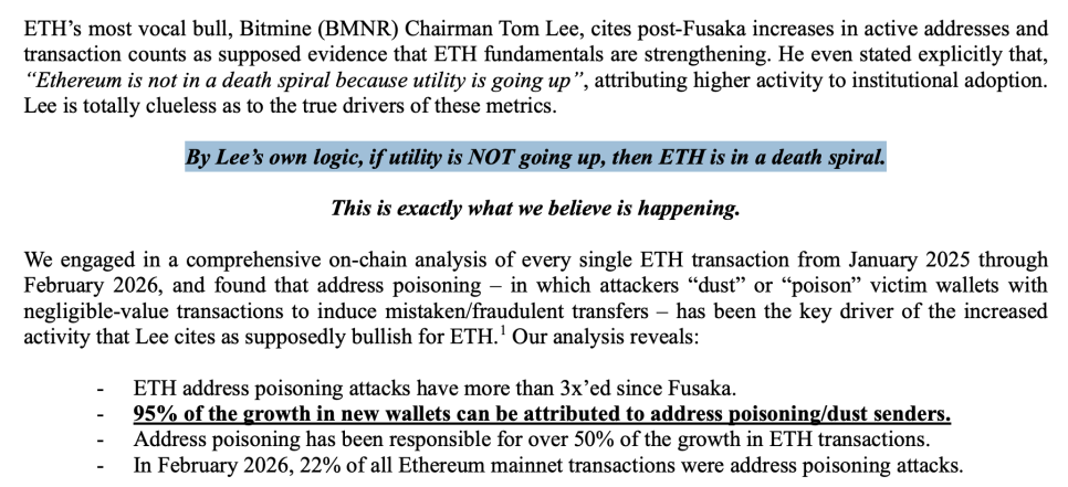 바로 이 지점에서 펀드스트랫(Fundstrat) 대표이자 이더리움 재무 전략 기업 비트마인(BitMine) 회장인 톰 리(Tom Lee)와의 충돌이 생깁니다. 톰 리는 후사카 이후 이더리움의 활성 주소 수가 117% 늘었고 네트워크 사용량이 80% 증가했다며 "이더리움 펀더멘털이 강해지고 있다, 유틸리티가 올라가고 있으니 데스 스파이럴이 아니다"라고 주장해왔는데요. 컬퍼는 이 수치 증가의 대부분이 주소 중독 공격 때문에 부풀려진 것이라고 반박했습니다. 2월 기준 이더리움 메인넷 전체 거래의 22%가 주소 중독 공격이었다는 분석도 내놨고요.