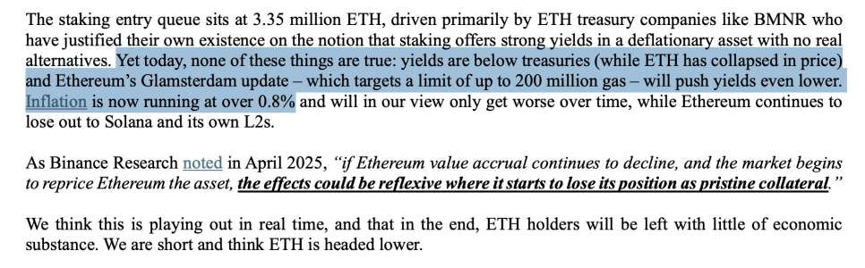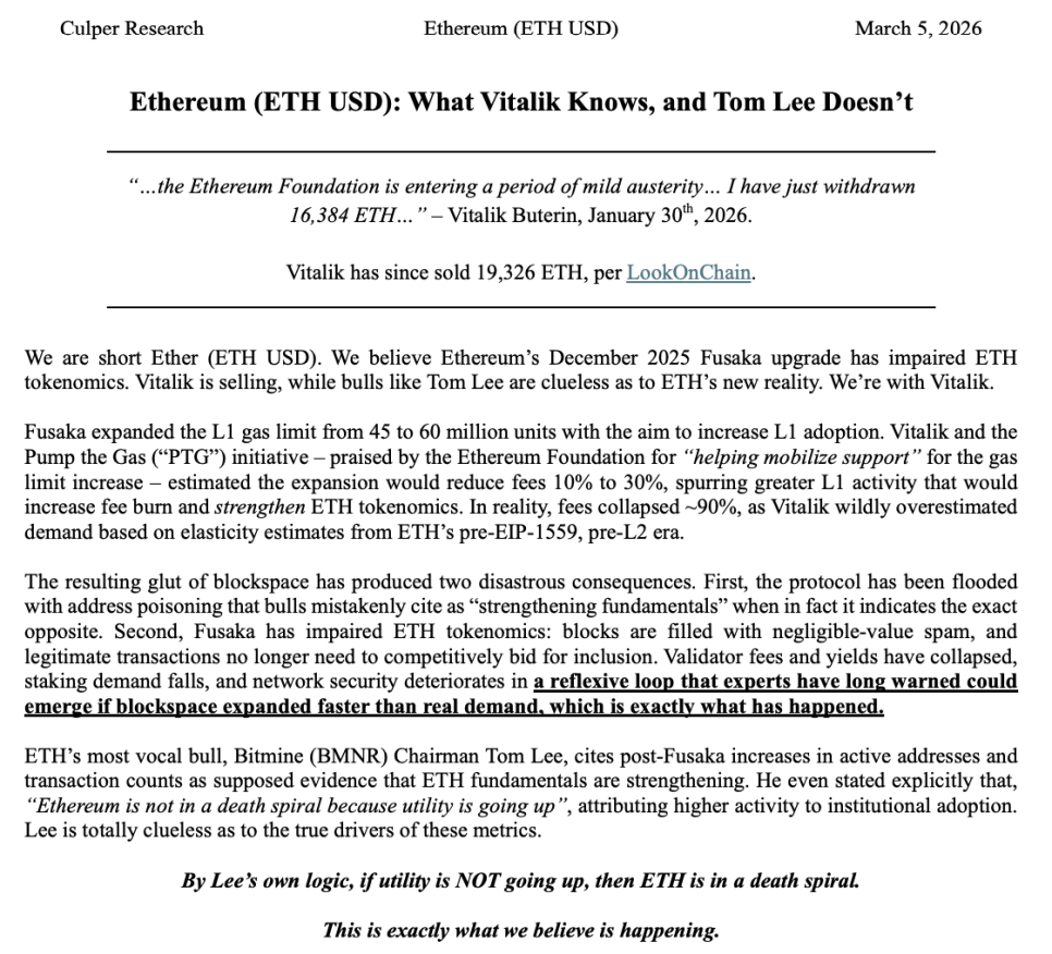 때문에 컬퍼가 이미 공매도 포지션을 잡은 상태에서 이 보고서를 냈다는 점은 감안해야 합니다. 트위터 포스팅에 따르면 이더리움과 더불어 비트마인 등 이더리움 DAT 기업들도 함께 공매도를 하고 있다고 하는데요. 이렇게 이해충돌이 있는 상황이고, 보고서 첫 장에도 버젓이 그 사실이 적혀 있죠. 반론도 분명히 있습니다. 수수료가 낮아지면 사용자 입장에서는 더 쓰기 편해지고, 장기적으로 생태계가 더 넓어질 수 있다는 시각도 있으니까요.