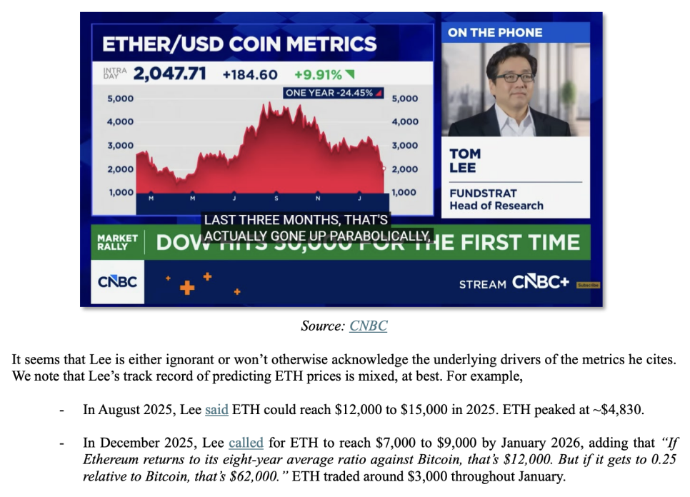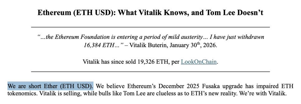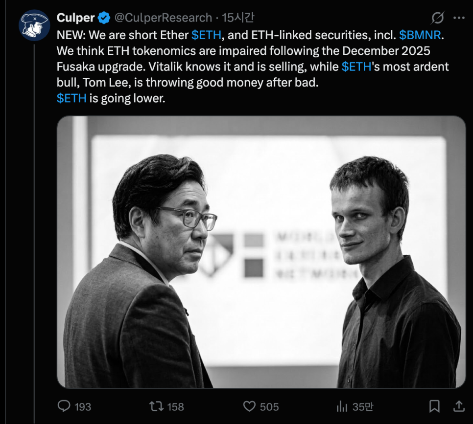 여기에 이더리움 공동창업자 비탈릭 자신이 올해 들어 약 2만 ETH, 현재 시세로 약 400억 원어치를 팔았다는 점도 시장이 주목하는 부분입니다. 그는 1월 30일에 이더리움 재단이 "경미한 긴축 기조에 들어간다"며 1만 6,384 ETH를 팔겠다고 먼저 공지했는데, 실제로는 예고보다 16% 더 많은 1만 9천여 개를 팔았습니다. 컬퍼는 "비탈릭은 팔고 있고, 톰 리는 모르고 있다. 우리는 비탈릭 편"이라고 꽤 직설적으로 표현했죠. 왜냐, 본인들은 이더리움에 공매도 포지션을 잡았기 때문이죠.