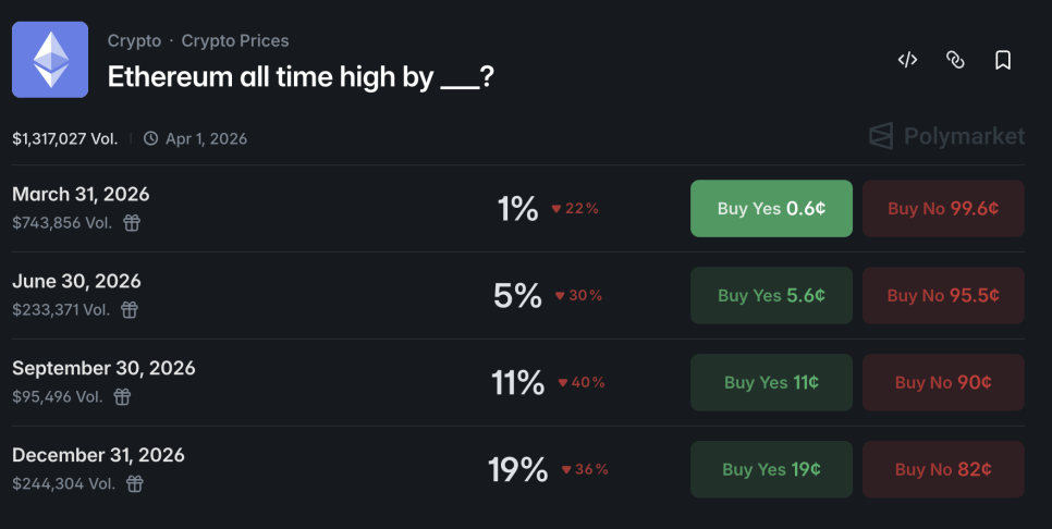 칼시에서는 올해 이더리움이 5,000달러를 넘을 가능성을 고작 15%로 보고 있고, 폴리마켓에서는 올해 신고가 달성 가능성도 19%에 불과합니다.