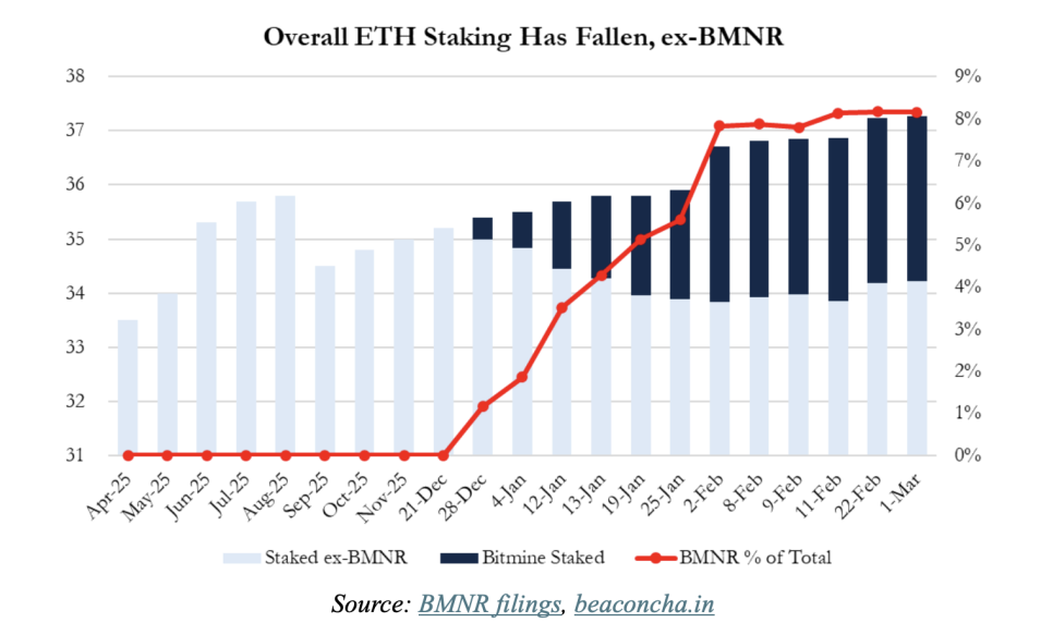 컬퍼는 이더리움 네트워크를 검증하는 밸리데이터의 하루 활성 수가 이미 2025년 7월에 정점을 찍고 내려오고 있다는 데이터도 제시했습니다. 그런데 현재 스테이킹 대기열에는 335만 ETH가 줄을 서 있는데, 컬퍼는 이게 대부분 비트마인이 끌어올린 숫자라고 분석했습니다. 즉, 실제 시장 수요가 아니라 한 회사의 대량 매입이 지표를 왜곡하고 있다는 거죠.