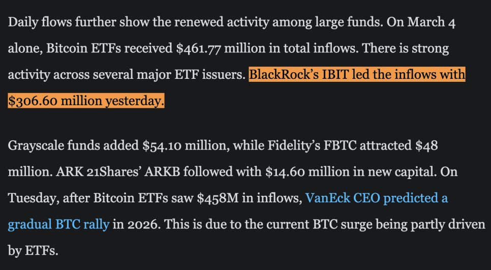 선두는 역시 블랙록(BlackRock)이었는데요. 2월 24일 이후 누적으로 약 2만 1,800 비트코인, 금액으로는 6억 달러어치를 사들였습니다. 3월 4일 하루에만 3억 600만 달러를 끌어모았고요. 그레이스케일, 피델리티, ARK 21Shares도 각각 수천만 달러씩 유입이 있었습니다.