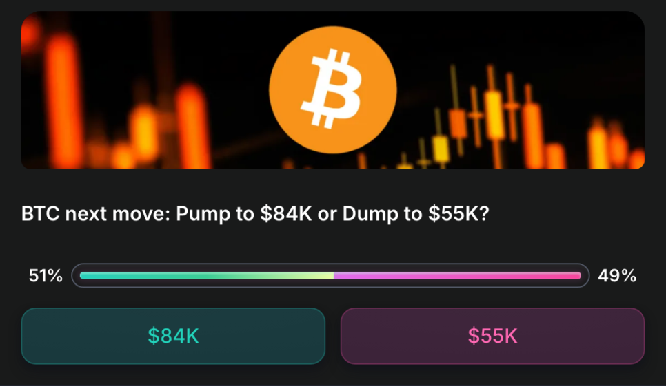 예측 시장인 미리어드(Myriad)에서도 분위기가 바뀌었는데요. 한 달 가까이 "5만 5천 달러로 먼저 떨어진다"는 쪽이 우세했다가, 수요일을 기점으로 "8만 4천 달러까지 오를 것"이라는 쪽이 51%로 뒤집혔습니다.
