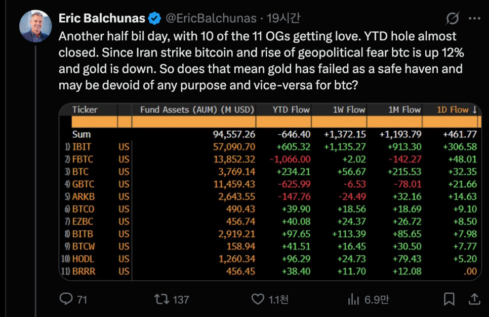블룸버그 ETF 애널리스트 에릭 발추나스(Eric Balchunas)는 11개 비트코인 ETF 중 10개에서 동시에 자금이 들어왔다고 짚었는데요. 올해 초부터 쌓이던 ETF 자금 유출 적자가 이번 유입으로 거의 다 메워졌다고도 했습니다. 5주 동안 빠져나간 돈이 불과 며칠 만에 거의 돌아온 셈이죠.