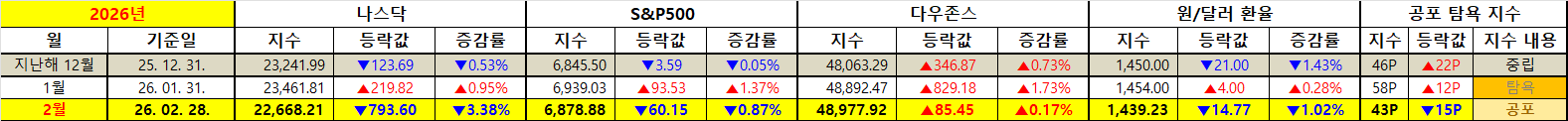 지난 2월 28일 마감된 지수 현황을 보면 시장의 분위기가 얼마나 급격하게 변했는지 한눈에 알 수 있습니다. 기술주 중심의 나스닥 지수는 22,668.21포인트로 마감하며 한 달 동안 무려 3.38%라는 큰 폭의 조정을 겪었으나 가치주가 포진한 다우존스 지수는 오히려 0.17% 상승한 48,977.92포인트를 기록하며 대조적인 모습을 보였습니다. 에스앤피오백 지수 또한 0.87% 하락하며 전반적인 시장의 하방 압력이 존재했음을 증명하고 있는데 특히 공포 탐욕 지수가 지난달 탐욕 단계인 58포인트에서 이번 달 공포 단계인 43포인트로 15포인트나 급락한 점은 투자 심리가 상당히 위축되었음을 시사합니다. 원/달러 환율은 1,439.23원으로 지난달보다 14.77원 하락하며 마감되었는데 이는 달러 강세 현상이 다소 진정되며 원화 자산 가치 방어에 긍정적인 역할을 해주었습니다.