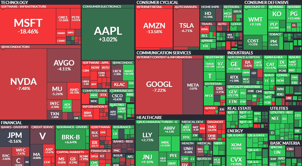 이러한 지수의 흐름은 월간 증시 지도에서도 고스란히 나타나고 있는데 시가총액 상위 종목인 마이크로소프트가 18.46% 하락하고 인공지능 열풍을 주도하던 엔비디아가 7.48% 내리는 등 빅테크 종목들이 대거 붉은색으로 물들며 나스닥의 하락을 주도했습니다. 특히 에이엠디가 20.78% 급락하고 오라클이 15.86% 하락하는 등 그동안 급등했던 기술주들에 대해 시장이 매서운 '가격 조정'을 가하고 있는 모습입니다. 반면 애플은 3.02% 상승하며 기술주 내에서도 차별화된 흐름을 보였고 소비재와 헬스케어 섹터는 눈부신 초록색 빛을 발하며 시장의 버팀목이 되었습니다. 월마트가 9.76% 그리고 코카콜라와 프록터앤갬블이 각각 14.30%와 13.48% 급등하는 등 실적이 뒷받침되는 우량 가치주로의 자금 이동이 뚜렷하게 관찰되었는데 이는 시장이 무너지는 것이 아니라 건강한 '섹터 로테이션'이 일어나고 있음을 의미합니다.