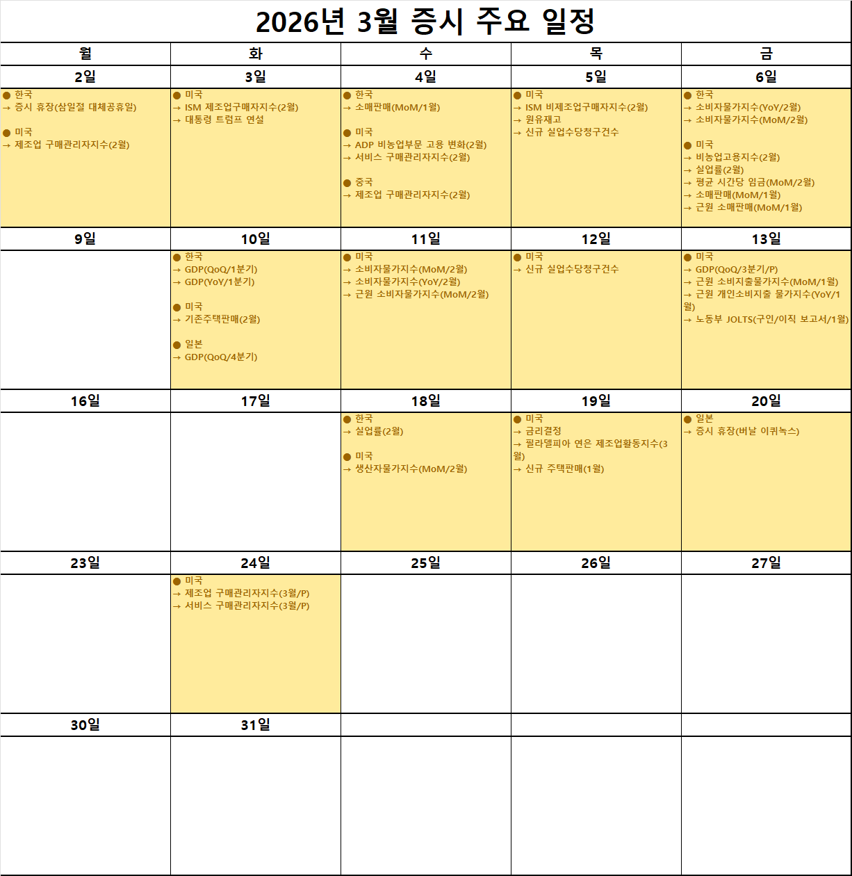 새롭게 시작되는 3월의 첫날인 2일은 한국 증시가 삼일절 대체공휴일로 휴장하며 잠시 숨을 고르는 시간을 갖게 됩니다. 하지만 미국 시장은 제조업 구매관리자지수 발표를 시작으로 바쁘게 움직일 예정인데 특히 3일에 예정된 대통령 트럼프 연설은 향후 미국의 경제 정책 방향을 가늠할 수 있는 가장 중요한 분수령이 될 것으로 보입니다. 시장은 대통령의 발언 속에서 향후 규제 완화나 관세 정책에 대한 힌트를 찾으려 할 것이며 이는 단기적인 시장 변동성을 키우는 요인이 될 수 있습니다. 우리는 이러한 정치적 소음에 일희일비하기보다 정책의 실질적인 수혜가 어떤 섹터로 향할지 차분하게 분석하는 자세가 필요합니다.