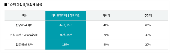 전용면적 60㎡ 이하는 가점제 40%, 추첨제 60%가 적용되고 전용면적 60㎡ 초과 85㎡ 이하는 가점제 70%, 추첨제 30% 적용, 전용면적 85㎡ 초과는 가점제 80%, 추첨제 20%가 적용된다.