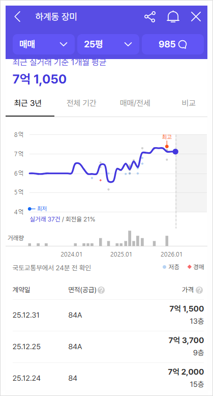 하계장미는 1989년 준공되어 현재 40년이 다 되어가는 매우 오래된 아파트이다. 현재 서울시의 신속통합기획 자문방식을 도입하여 기존 1,880세대 규모에서 2,775세대로 늘릴 예정이다. 하계장미는 23년 정밀안전진단에 통과하였고 하계동 역세권 사업과 더불어 재건축 보정계수 적용으로 용적률에 대한 인센티브까지 기대되는 횡보를 보인다. 또한, 노원구 내에서도 역세권 종상향이 처음으로 적용된 단지로 준주거지역 상향을 통해 사업성이 획기적으로 높아질 것으로 보인다.
