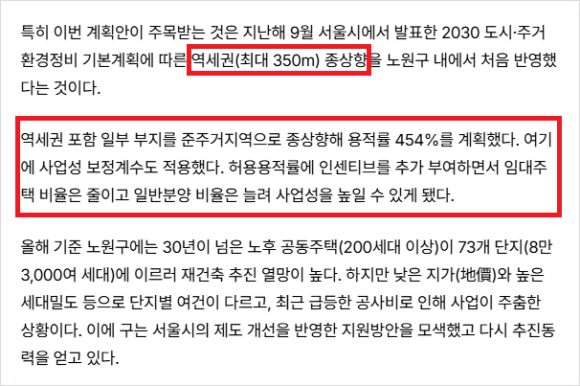 비례율은 {[총 수익 - 총 비용]} ÷ 종전자산평가액}이므로 1.01이란 애매한 비례율이 나온다. 물론 서울 치곤 낮은 분양가를 잡았기에 용적률 혜택을 받았음에도 불구하고 비례율이 낮게 나왔고 공사비도 높게 잡았기 때문이다. 하계동, 중계동, 상계동 측에는 아직 신축이 드물고 신축 역시 서울 평균 이하의 가격 수준이다. 하지만 재건축이 많이 되어 신축들이 많이 생긴다면 사람들이 더 모여들고 개발되면서 향후 분양가가 더 높아질 수도 있다.