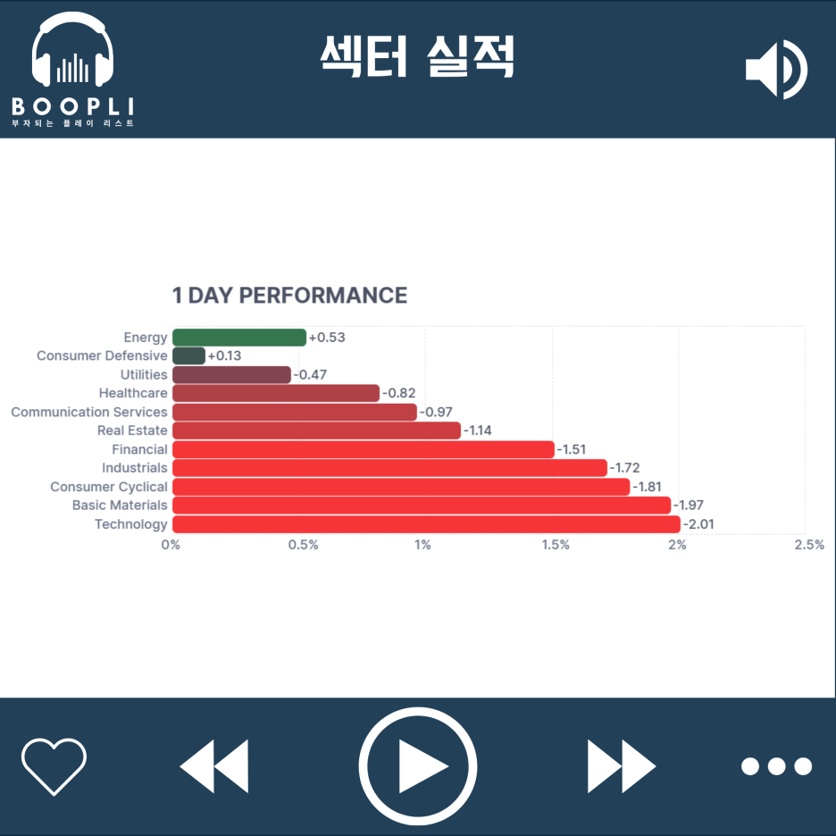 오라클과 오픈AI의 AI 데이터센터 확장 계획 철회로 기술주가 하락을 주도했고, 이어서 원자재, 소비 순환재, 산업재, 금융, 부동산, 커뮤니케이션 서비스, 헬스케어 순으로 약세