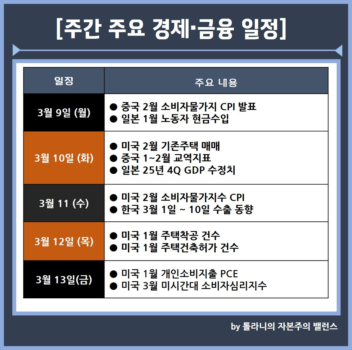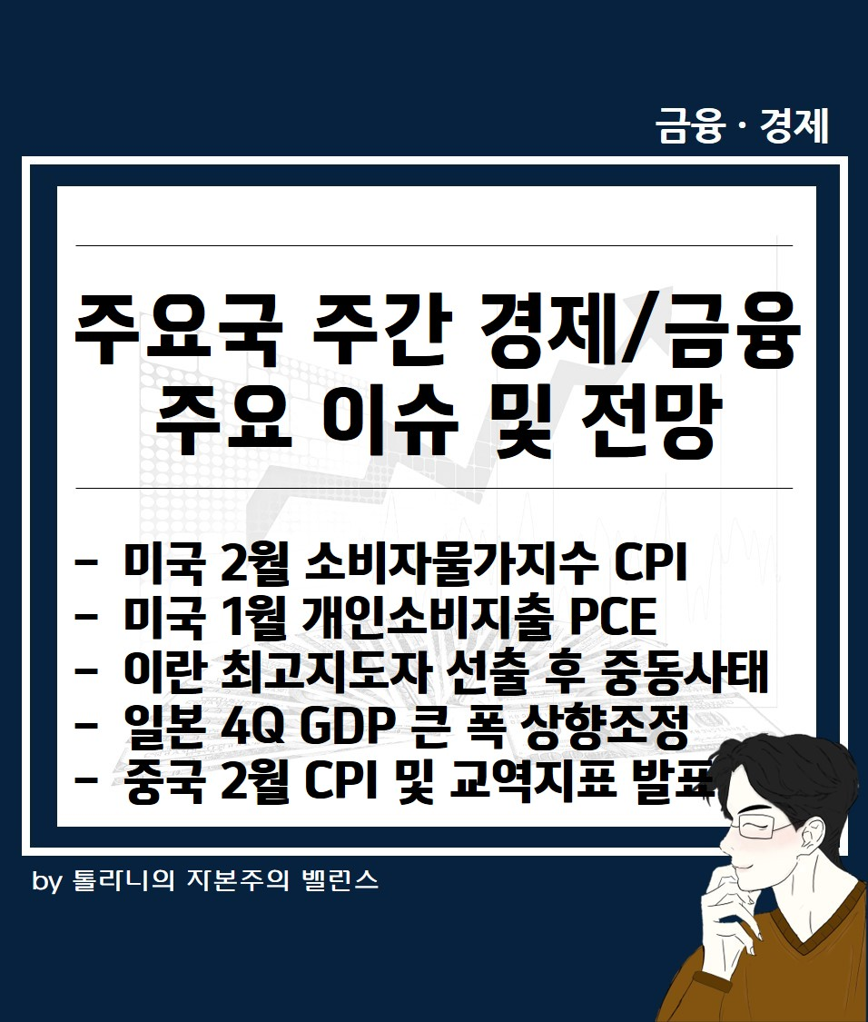 지금까지 '미국 2월 소비자물가지수 CPI, 1월 개인소비지출 PCE 등 주간 증시 일정 및 주요 국가 경제·금융 이슈' 관련하여 알아보았는데요.