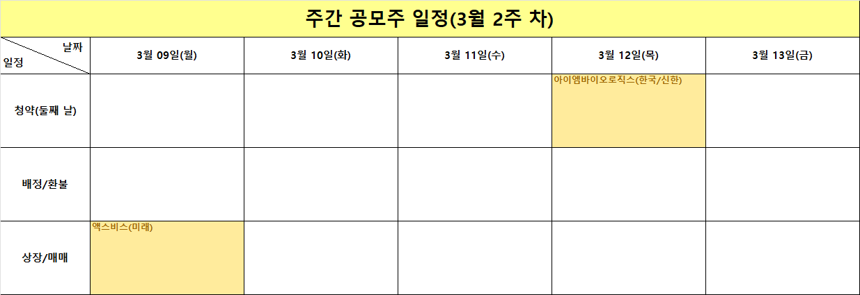 지난주에 이어 3월의 두 번째 주가 시작되었는데 이번 주 공모주 시장은 비교적 차분한 흐름 속에서도 우리가 주목해야 할 핵심적인 일정들이 준비되어 있습니다. 전체적인 일정을 살펴보면 상장 종목 하나와 청약 종목 하나로 구성되어 있어 자금 운용 면에서 큰 부담은 없지만 그만큼 개별 종목에 대한 집중도가 높아질 수 있는 시기라고 생각합니다. 투자자로서 항상 깨어 있는 마음으로 시장의 변화를 관찰하며 이번 주에도 원칙을 지키는 투자를 이어나가보겠습니다.