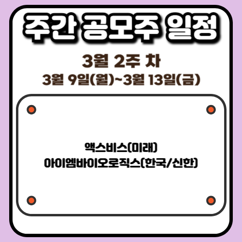 이번 주 월요일인 3월 09일에는 미래에셋증권을 주관사로 하여 공모주 청약을 진행했던 액스비스의 상장 일정이 예정되어 있습니다. 액스비스는 이번 주 시장의 문을 여는 첫 번째 주자로서 투자자들의 많은 관심을 받고 있으며 상장 당일의 수급 상황이 전체적인 공모주 시장 분위기에 영향을 줄 수 있습니다. 저는 평소 장기 투자를 지향하며 기업의 내재 가치를 중요하게 생각하지만 공모주 영역에서만큼은 철저하게 '상장 당일 매도'라는 원칙을 기계적으로 실천하려 노력하고 있습니다. 이는 공모주가 상장 초기에 보여주는 높은 변동성 리스크를 회피하고 확정적인 수익을 챙기기 위한 저만의 생존 전략이기도 합니다.