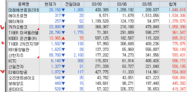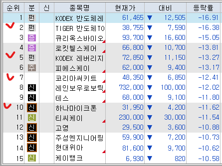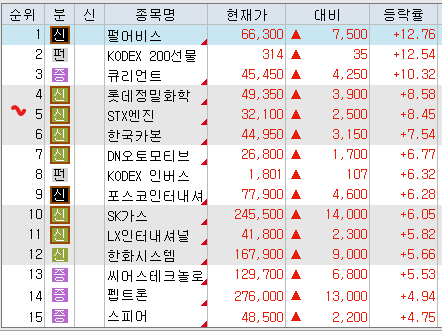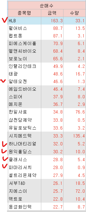 매도 : 한화 DB하이텍 CJ 오리온홀딩스 유안타증권 대신증권 포스코퓨처엠 POSCO홀딩스 이수화학 미래에셋증권 이수페타시스 SOL한국원자력 포스코엠텍 삼성중공업 한화에어로스페이스 SK텔레콤 롯데에너지머터리얼즈 삼성E&A 케이엠더블유 두산에너빌리티 감성코퍼레이션 솔브레인홀딩스 에스티아이(+53.80%) 에스엠 한화오션 한미반도체 한전기술 미코 현대로템 LG씨엔에스 엘앤에프 하나마이크론 이노와이어리스 대주전자재료(+34.17%) 제주반도체 한화엔진 에코프로 테크윙(+55.62%) 상아프론테크 Tiger반도체 동운아나텍 대성에너지(+70.49%) 나노신소재 와이지엔트 피엔티 서진시스템 케어젠(+61.90%) 심텍 수프리마(+40.66%) 원익ips(+37.67%) 에코프로비엠 HD건설기계 한화시스템(+61.23%) 이녹스텀단소재(+15.0%) HD현대중공업 두산퓨얼셀 스피어 디앤디파마텍 디어유 카카오페이 HPSP 대한조선 PLusK방산 에코프로머티 지투지바이오 TIMEK바이오 온코닉테라퓨틱스 알지노믹스 한화비전(+48.26%) 코오롱티슈진