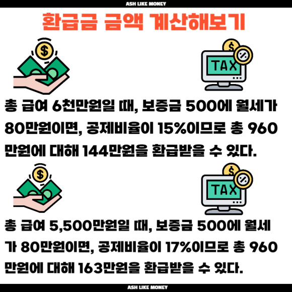 내가 연봉이 6천만원이고 보증금 500만원에 월세 80만원이라면 연 소득 6천만원에 대한 공제비율이 15%이므로 80만원 × 12개월 총 960만원에 대해 공제가 된다. 즉, 공제금액은 960만원 × 0.15이므로 144만원을 월세 환급을 받을 수 있게 된다. 하지만 연봉이 5,500만원이라면 17%이므로 공제금액이 960만원 × 0.17이므로 163만원이다.