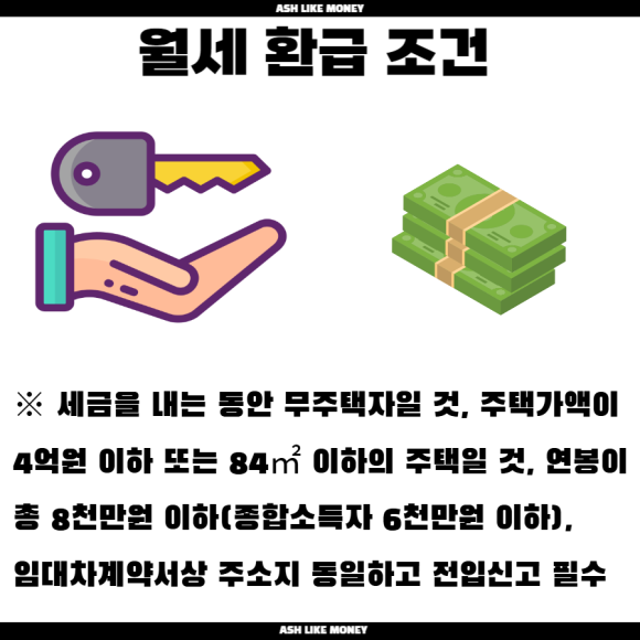 이렇게 월세부담이 커질수록 월세 환급금에 대한 중요도가 커진다. 월세환급금은 사실 월세세액공제 제도라 할 수 있다. 월세세액공제는 무주택 세대주가 월세를 내면 세금의 일부를 다시 환급받는 정책이다. 월세환급을 받기 위해선 급여조건과 무주택 세대주이냐, 주택의 기준시가 조건이 붙는다.