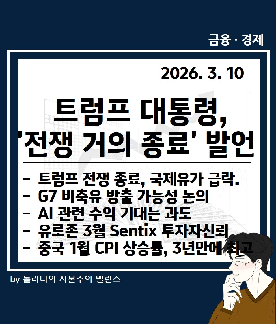 지금까지 '트럼프 대통령, '전쟁 거의 종료' 발언, 국제유가 급락, 주식 시장은 '롤로코스터 장세' 등 주요 국가 경제·금융 동향' 관련하여 알아보았는데요.
