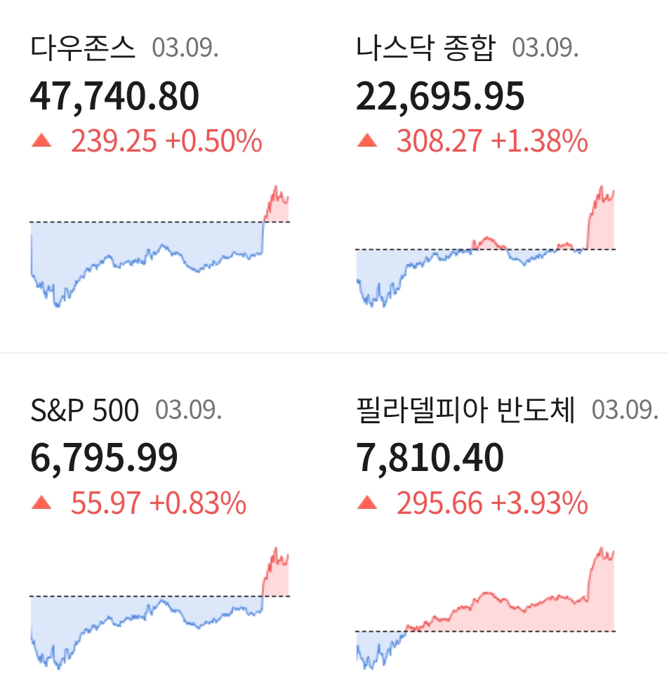 현지 시간 9일 미국 뉴욕 증시는 장중 내내 하락세를 보이다, 트럼프 대통령의 전쟁이 거의 종료 되어간다는 발언으로 극적으로 3대 지수 모두 상승 마감하였습니다.