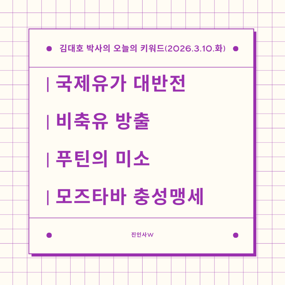 #김대호박사의오늘의키워드 #sbsbiz채널 #경제흐름읽기 #거시경제읽기 #세계주요이슈읽기 #한국경제주요이슈보기 #주식들여다보기 #부동산들여다보기 #시간은소중히쓰자 #국제유가대반전 #비축유방출 #푸틴의미소 #모즈타바충성맹세
