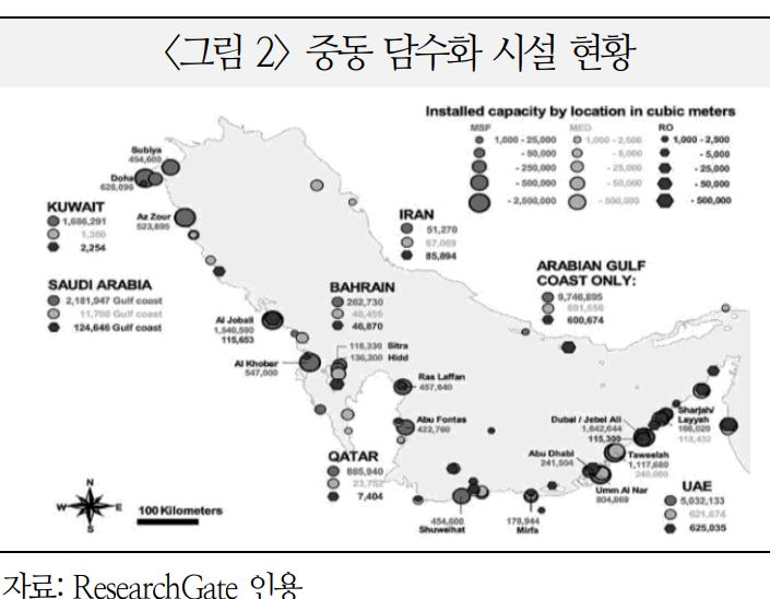 ㅇ 중동 국가 중 쿠웨이트 및 카타르는 수자원 공급을 담수화 시설에 전적으로 의존하고 있으며, 두바이와 리야드 등 대도시의 의존도가 특히 높은 편