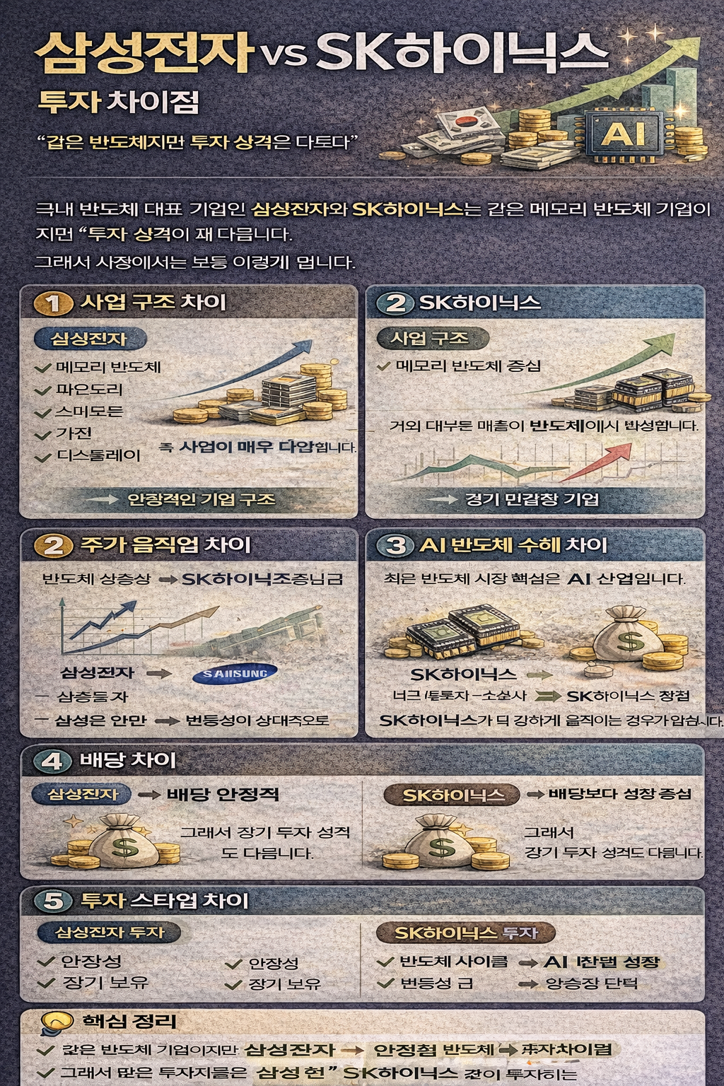 국내 반도체 대표 기업인 삼성전자와 SK하이닉스는 같은 메모리 반도체 기업이지만 투자 성격이 꽤 다릅니다.
