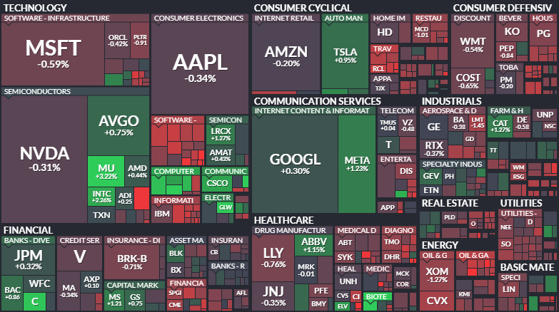 뉴욕 주요 지수 중 나스닥은 22,720.99로 마감하며 소폭 상승세를 유지했으나 다우와 S&P 500은 각각 0.41%와 0.22% 하락하며 엇갈린 행보를 보였습니다. 증시맵을 상세히 살펴보면 엔비디아와 마이크로소프트 등 시총 상위 기술주들이 소폭 하락하며 지수에 부담을 주었지만 마이크론이 3.22% 상승하고 아바고와 인텔이 견조한 흐름을 보이며 반도체 섹터는 전반적으로 시장을 방어하는 역할을 했습니다. 구글과 메타 역시 1% 내외의 상승을 기록하며 커뮤니케이션 서비스 섹터의 매수세를 보여주었고 원/달러 환율은 장중 1,499원까지 치솟았다가 유가 하락 기대감에 힘입어 1,469.74원으로 내려오며 급격한 원화 약세 흐름에서는 일단 한숨을 돌린 모습입니다.