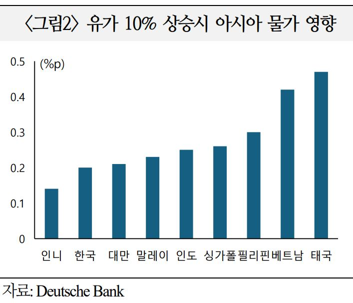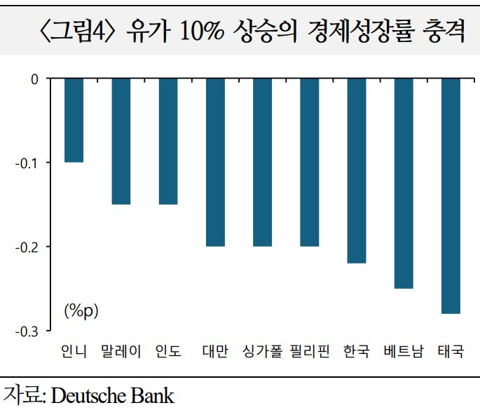 ㅇ 유가가 10% 상승할 때마다 소비·수출 둔화, 생산성 저하 등으로 태국, 베트남, 필리핀 등 아시아 주요국의 성장률이 0.2~0.3%p 하락할 가능성. 또한 사태가 장기화되면서 고유가를 유지할 경우 취약국의 스태그플레이션 가능성에도 유의(DeutscheBank)
