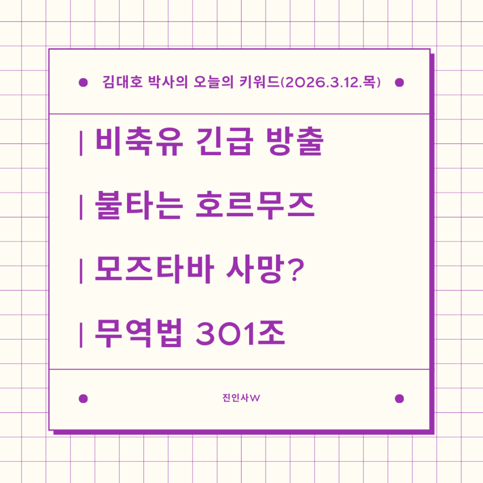 #김대호박사의오늘의키워드 #sbsbiz채널 #경제흐름읽기 #거시경제읽기 #세계주요이슈읽기 #한국경제주요이슈보기 #주식들여다보기 #부동산들여다보기 #시간은소중히쓰자 #비축유긴급방출 #불타는호르무즈 #모즈타바사망 #무역법301조