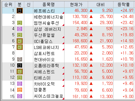 캐리 : 당정, 재생에너지 확대법 신속처리 소식 및 국제유가 상승에 따른 에너지 안보 중요성 부각 등에 태양광에너지 테마 상승 속 상한가