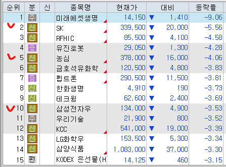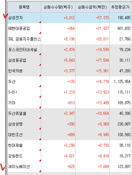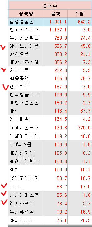 KOSPI에서는 외국인이 -3조110억 원을 순매도, 기관이 -2,402억 원을 순매도 순매도했음. KOSDAQ은 외국인이 -7,464억 원을 순매도 한 반면, 기관이 +2,241억 원을 순매수. 외국인은 KOSPI에서 건설과 기계/장비 업종을 매수했고, 전기/전자와 금융 업종을 매도