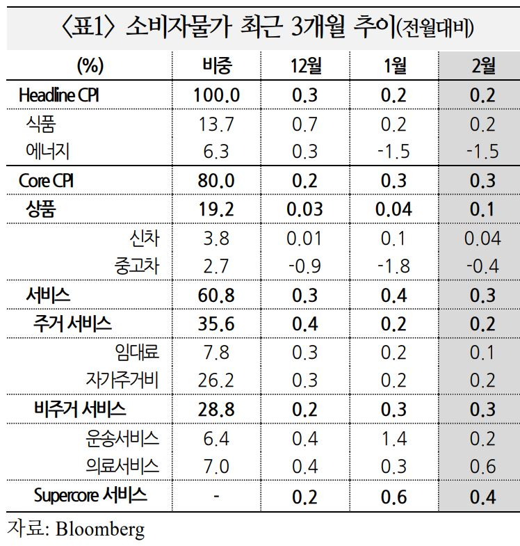 2월에도 소비자물가의 표면적인 안정세가 이어졌으나 ▲관세의 소비자 전가 지속 ▲비주거서비스 물가 추가 상승 가능성 등에 의한 경직성 잔존. 이러한 상황에서 중동 사태發 인플레이션 위험이 가세함에 따라 연준의 물가에 대한 경계감이 강화될 전망