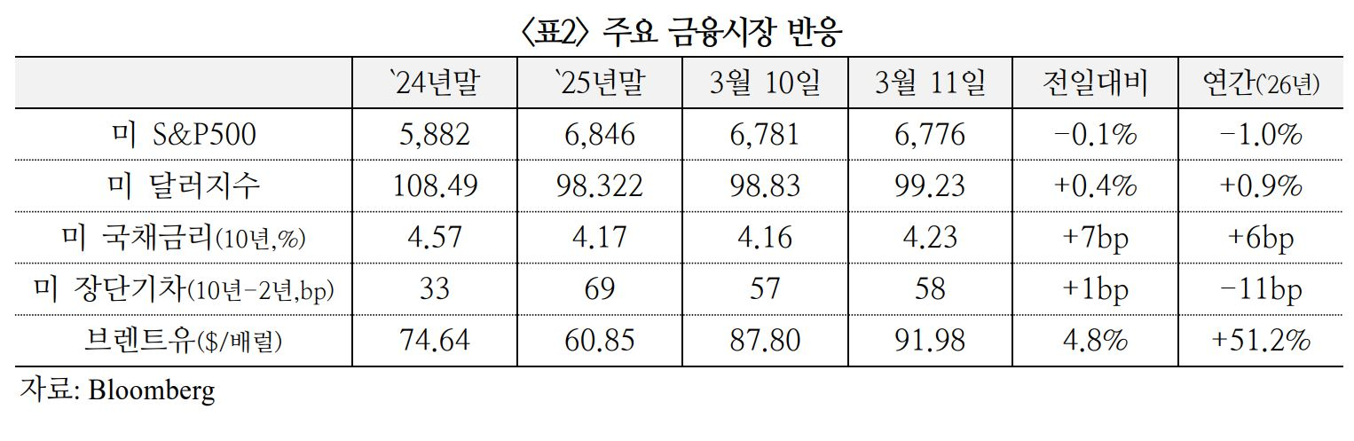 2월 CPI가 예상에 부합했음에도 불구하고 중동사태에 따른 인플레이션 우려로 금리인하 기대가 축소되며 주가 하락, 국채금리 상승, 달러화 강세