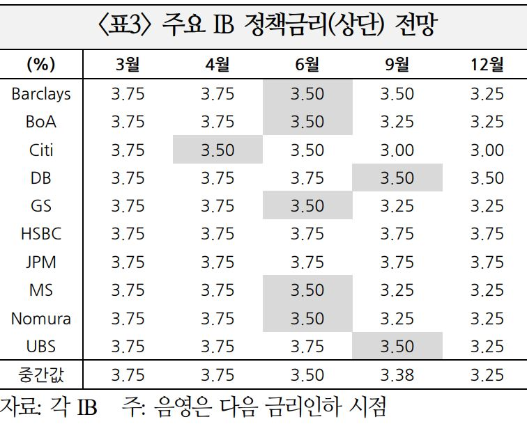 ※ 주요 IB 중 5월 이후 금리인하 재개 전망 10곳 중 7곳, 5월 전 금리인하 재개 1곳, 연내 동결 2곳