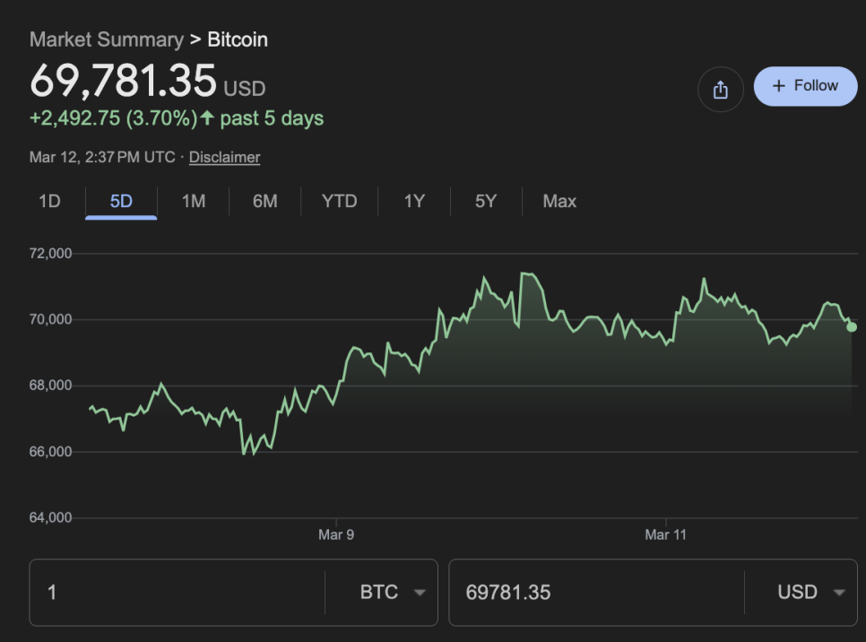 이 긴장감이 고스란히 암호화폐 시장으로 흘러들어오고 있습니다. 비트코인은 현재 6만 8천 달러에서 7만 1천 달러 사이의 박스권에 갇혀 있어요. 현재가는 약 6만 9,800달러 수준이고, 24시간 거래량은 10% 줄었습니다. 시장의 관심이 서서히 식고 있다는 신호로 읽힙니다.