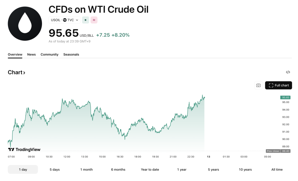 오늘 유가는 배럴당 95달러를 넘겼고, 이라크 해역에서 유조선 두 척이 공격받으면서 이라크가 석유 터미널 운영을 전면 중단했다는 소식도 전해졌습니다. 주요 경제국들이 비축 원유를 공동 방출하며 진화에 나섰지만, 역부족이었어요.