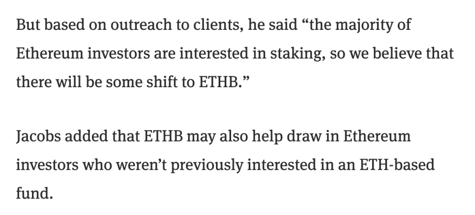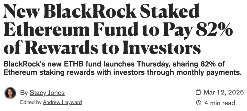 블랙록 미국 주식 부문 대표 제이 제이콥스(Jay Jacobs)는 기존 ETHA 펀드 투자자 일부가 ETHB로 옮겨올 것으로 예상하면서도, 이더리움을 직접 보유하며 스테이킹하던 투자자들을 새롭게 끌어들이는 효과도 클 것이라고 봤습니다. 직접 스테이킹과 이제 거의 동등한 조건이 만들어진 셈이거든요.