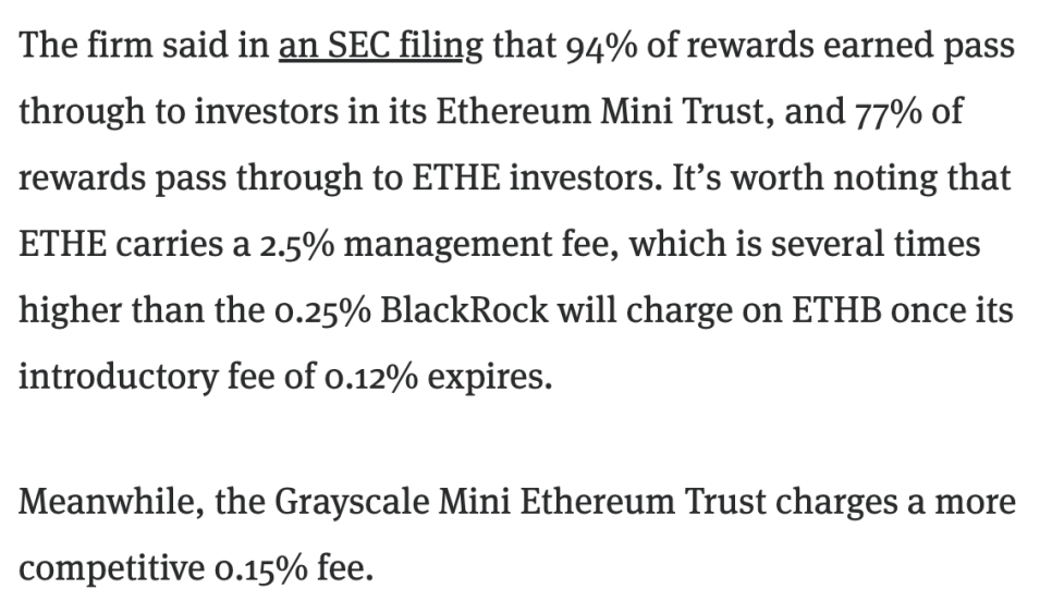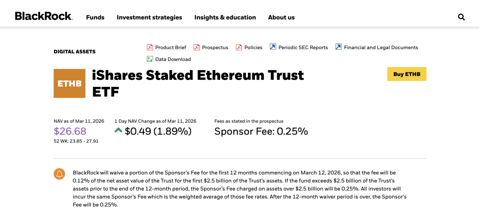 경쟁사인 그레이스케일(Grayscale)의 이더리움 미니 트러스트는 보상의 94%를 돌려주고, 기존 ETHE 펀드는 77%를 지급합니다. 숫자만 보면 블랙록의 82%가 미니 트러스트보다는 낮지만, 수수료에서 차이가 납니다. ETHB의 연간 운용 수수료는 0.25%로, ETHE의 2.5%에 비하면 훨씬 저렴하고, 초기에는 0.12%로 더 낮게 시작해요.