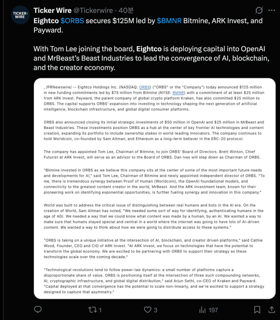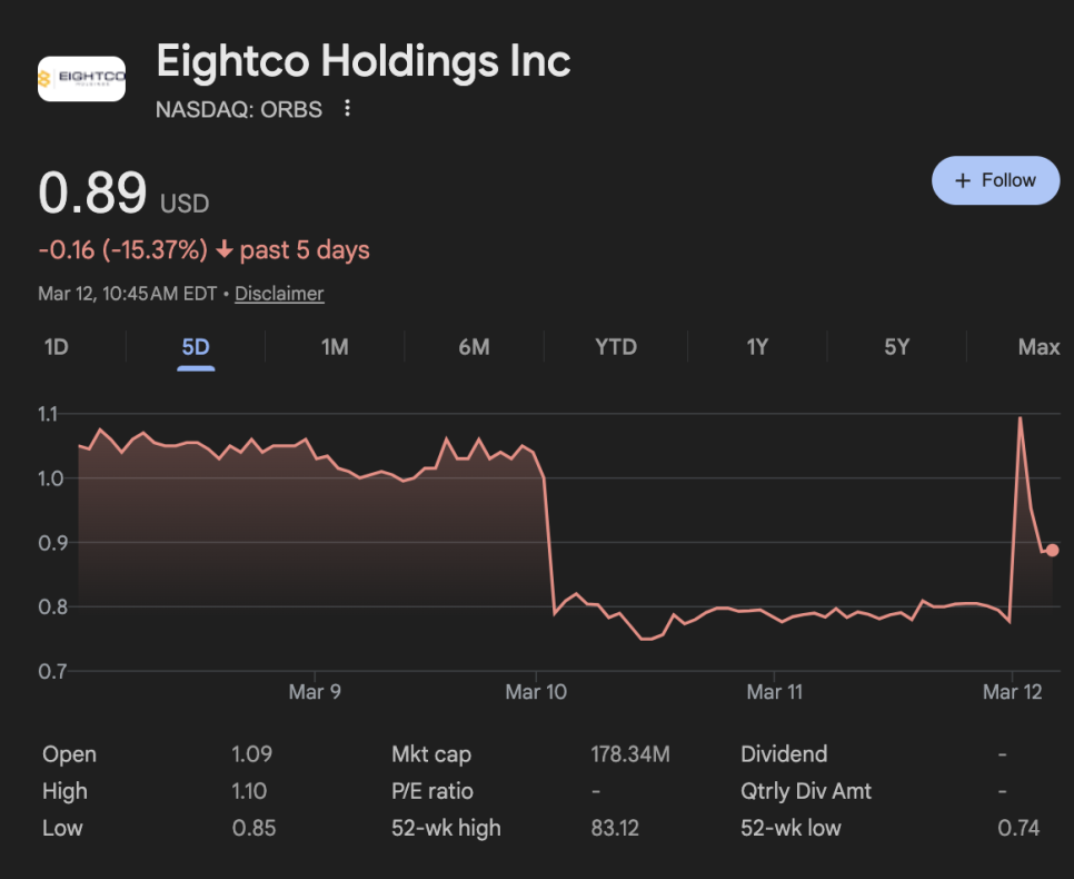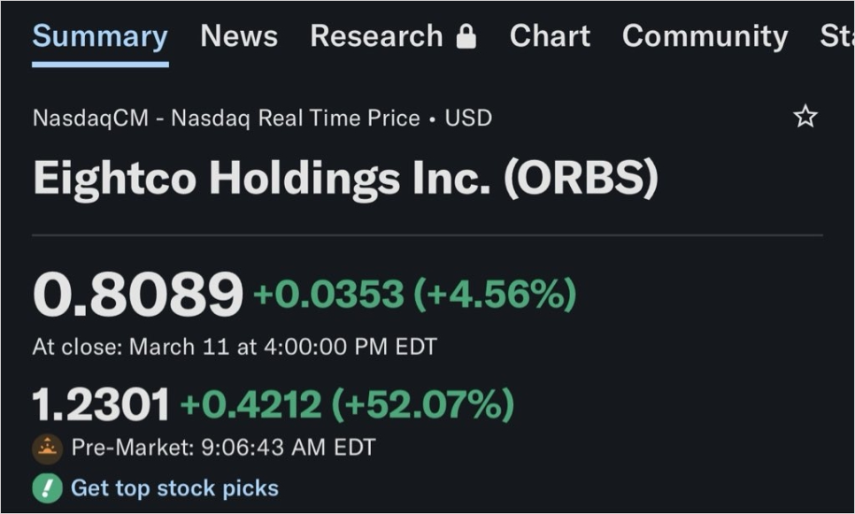 한편 같은 날, 나스닥 상장사 에잇코 홀딩스(Eightco Holdings, 티커: ORBS)도 시장의 주목을 받았습니다. 1억 2,500만 달러 규모의 투자 유치를 발표하면서 주가가 뛰어올랐거든요.