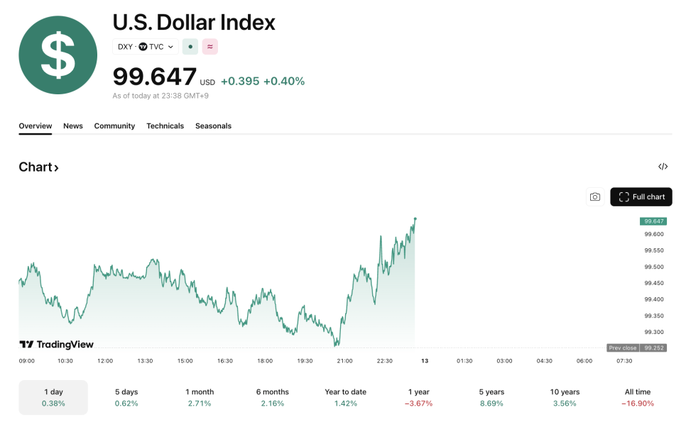 미국 달러 인덱스(DXY)도 99.5까지 올라가면서 투자자들이 위험 자산에서 발을 빼는 분위기가 역력합니다.