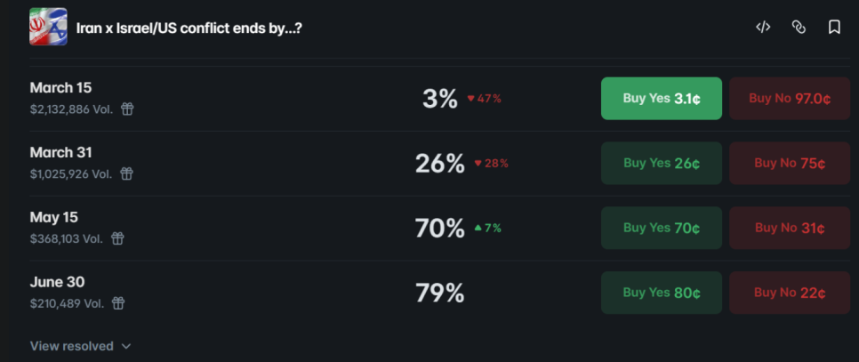 예측 시장 플랫폼 폴리마켓(Polymarket) 데이터에 따르면, 현재 진행 중인 미국-이란 분쟁이 5월 15일 이전에 끝날 가능성이 70%까지 치솟았습니다. 쉽게 말해, 시장 참여자 대다수가 전쟁이 꽤 오래 가겠구나라고 보고 있다는 거죠.