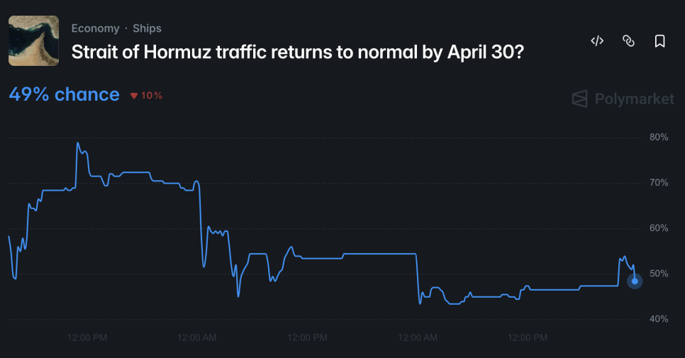 폴리마켓에서는 중동의 핵심 해상 교통로인 호르무즈 해협의 통행이 4월 30일까지 정상화될 가능성을 49%로 보고 있습니다. 사실상 반반인 셈이죠. 2027년 이전에 미국-이란 핵 합의가 이뤄질 가능성도 낮아지고 있다는 예측도 나옵니다.