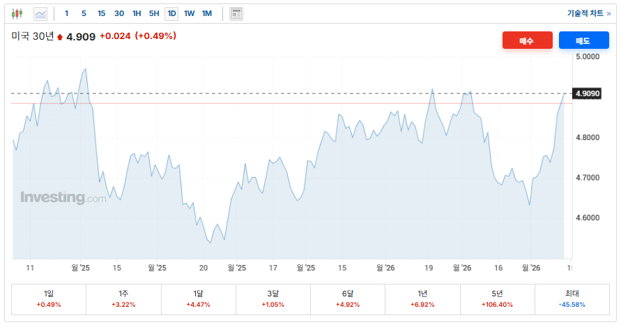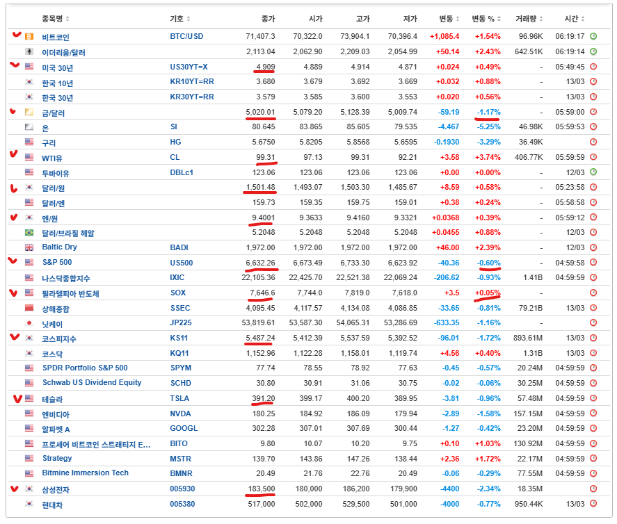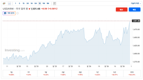 '슈퍼 달러'와 금리의 공습 : 전쟁 장기화로 유가가 급등하자 시장은 인플레이션이 다시 통제 불능 상태에 빠질 것을 우려. 이로 인해 미 국채 30년물 금리는 4.90%까지 치솟았고, 연준의 금리 인하 횟수 전망은 단 1회로 축소. 이 과정에서 달러화가 초강세를 보이며 원·달러 환율은 심리적 저항선인 1,500원을 돌파