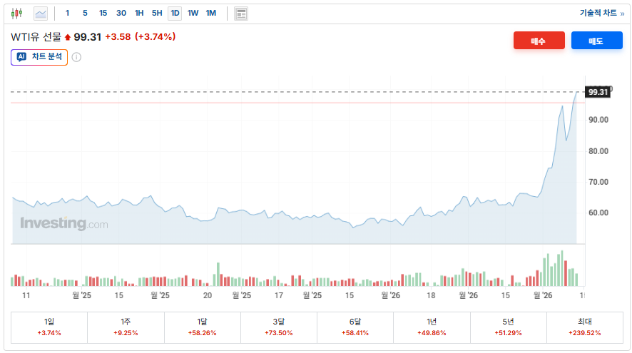 호르무즈 해협 봉쇄와 유가의 불길 : 이란의 새 지도부(모즈타바 하메네이)가 호르무즈 해협 봉쇄를 지속하면서 전 세계 석유 유통량의 20%가 차단. 미 재무부가 러시아산 원유에 대한 일시적 면허를 발행하며 시장 안정을 시도했으나, 미 국방부의 대규모 보복 타격 발표로 인해 유가는 다시 $100 선을 위협하며 상승
