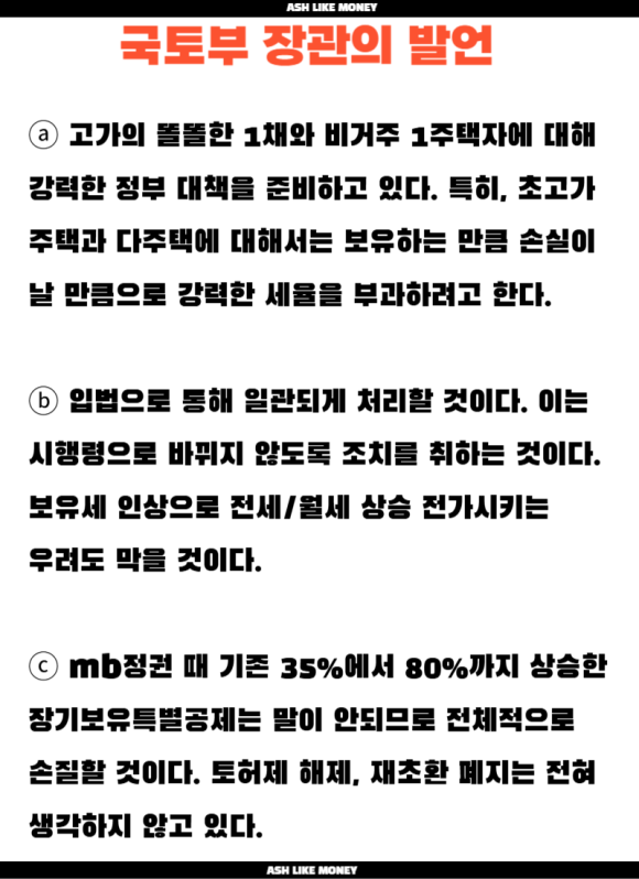 고가의 1주택에 대해 국토부장관은 강력한 세금부과 정책을 준비하고 있다고 밝혔다. 특히, 래미안 원베일리, 래미안 원펜타스, 래미안 퍼스티지, 아크로리버파크, 반포자이, 메이플자이, 래미안 첼리투스, 압구정현대, 여의도 아파트들, 목동아파트들 같은 상징적인 고가 아파트들에게 숨도 못 쉴 정도로 보유세를 때린다고 경고하였다. 국토부장관이란 직을 맡고 있는 사람이 아무리 소수의 사람이라고 해도 이렇게 강도 높은 발언을 하는 것은 보통일이 아니다.