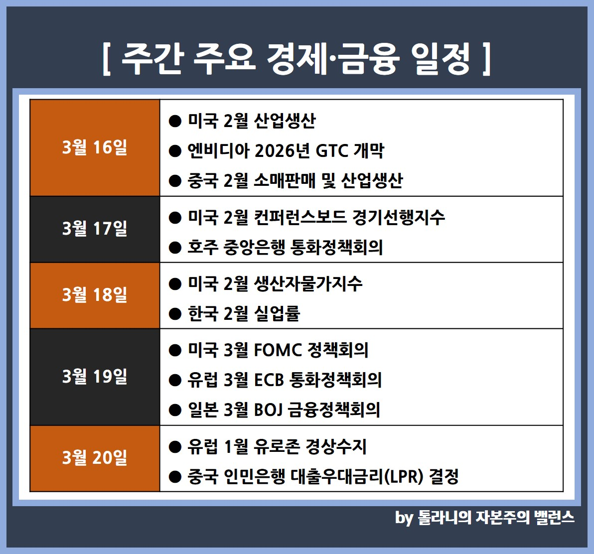 지금까지 '엔비디아 연례개발자회의 GTC 개막, 미국 3월 FOMC 회의 등 주간 증시 및 주요 국가 경제·금융 이슈' 관련하여 알아보았는데요.
